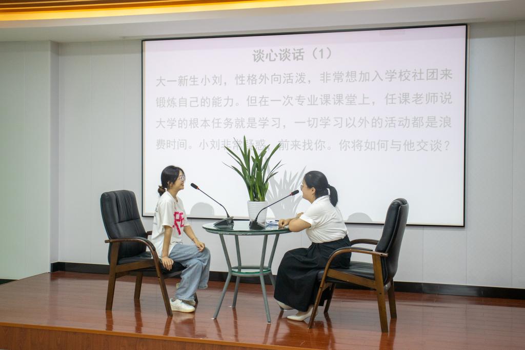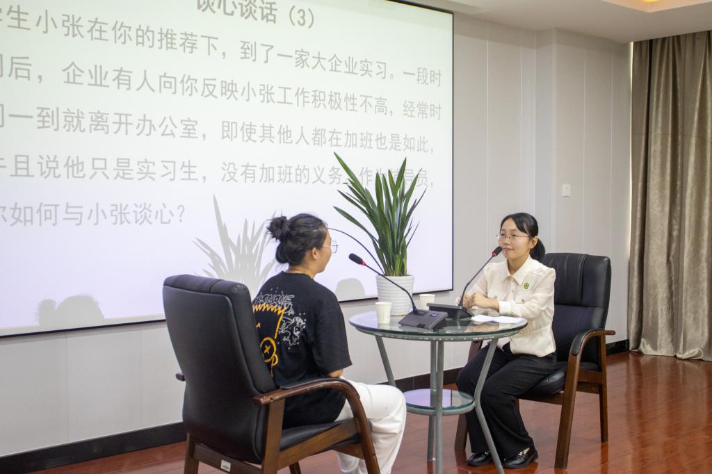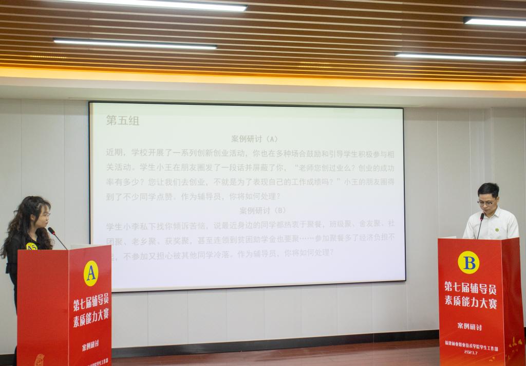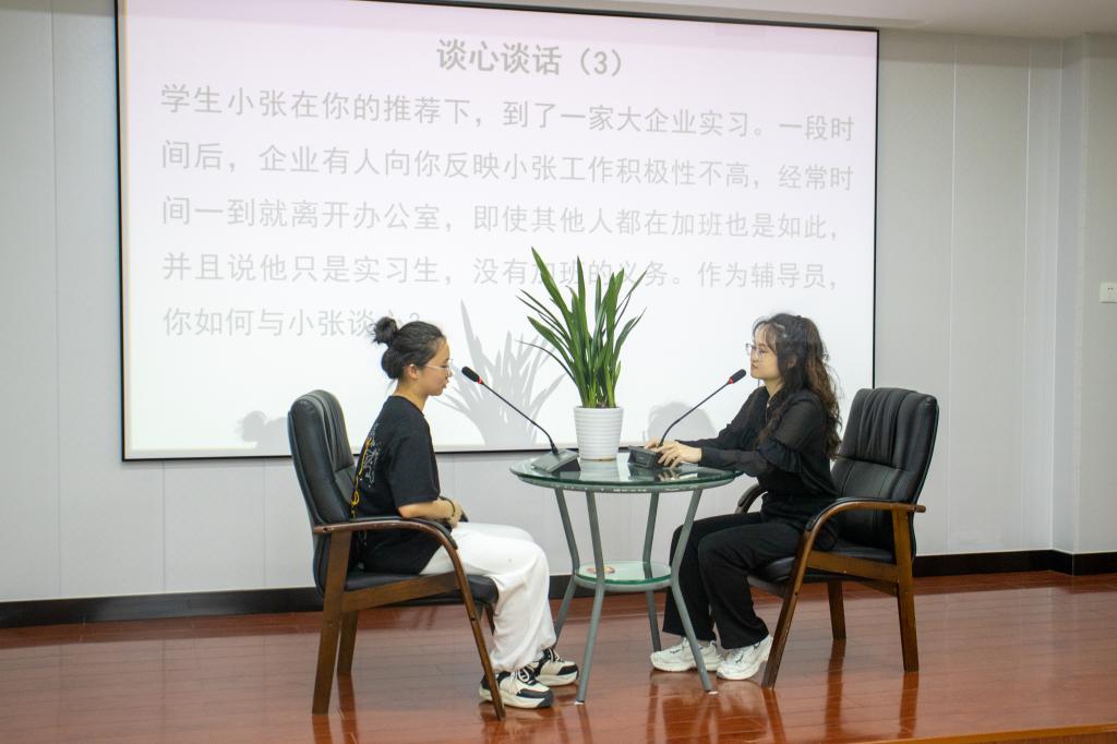 现场比赛环节在江南校区行政楼第四会议室举行。福建师范大学美术学院党委副书记乐有方,福建师范大学音乐学院党委副书记杜成煜担任比赛评委。我院学生工作部部长蔡敏、学生工作部副部长吴旻以及各系学生科长和全体专职辅导员进行了现场观摩。现场比赛由经济管理系辅导员吴艺菀主持。