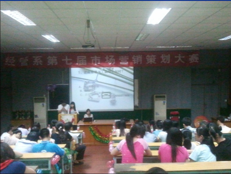 6月7日晚7:30,由经管系团总支主办,经管系学习部承办,经管系学生会协办的“第七届市场营销策划书大赛”在第一多媒体举行。到场的评委有经管系主任蔡敏,经管系党总支专职副书记张毅、系办公室主任兼教学秘书林文胜、经管系老师胡征莹、赵诗羽等7位老师,共有125人到场聆听。