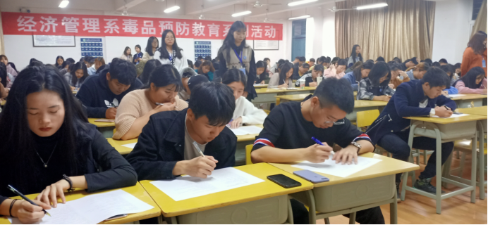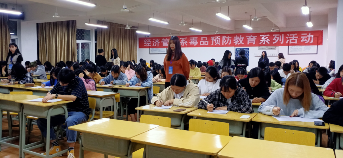 为进一步加强禁毒宣传的力度,提高广大学生的防范毒品意识和禁毒意识,使毒品远离自身,远离校园,经济管理系于11月13日晚七点半在科教楼302举办了一场关于原理毒品的考试,大一、大二纪律委员和各个宿舍舍长到场参加考试。