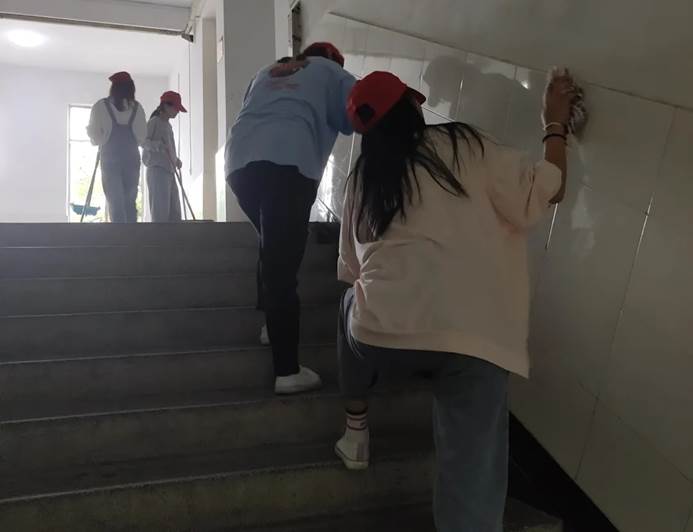 同学们自带扫把、抹布等清洁工具,提前在经管楼门口集合。活动准时开始,二十余名入党积极分子分成了六小组,一个小组负责一个楼层。大家分工明确,有的拿扫把清扫着地面,有的用手清理窗台上的垃圾,有的认真仔细地擦着楼梯的扶手、椅子、门等等,不放过每个边边角角。大家以劳动为荣,乐在其中。充分展现了同学们不怕苦不怕累的精神,勇于冲前面和承担责任的精神表现,这也正是对党优良作风的传承与发展的表现。