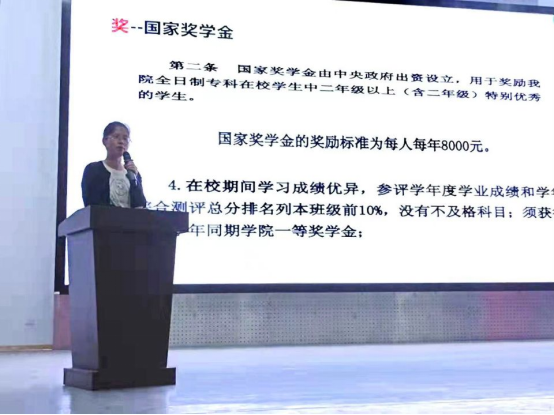 不让任何一个学生因为家庭经济困难而失学。林淋老师向同学们详细解读了学校的相关资助政策,介绍了不同类型奖学金的申请方式和条件,一一解开了同学们对资助政策的疑惑之处。向同学们介绍了各奖项的种类,奖励金额及评优条件。林淋老师激励大家继续保持昂扬斗志,向着未来砥砺前行。之后胡斌老师对学籍管理、考试管理、学位管理和违纪处分及学生日常管理的相关制度进行介绍,强调了旷课、考试违纪等行为导致的严重后果,要求同学们在今后的学习和生活中,严格遵守国家法律法规和学校规章制度。