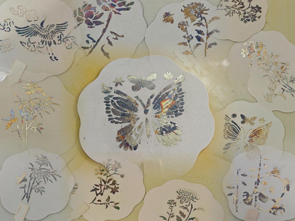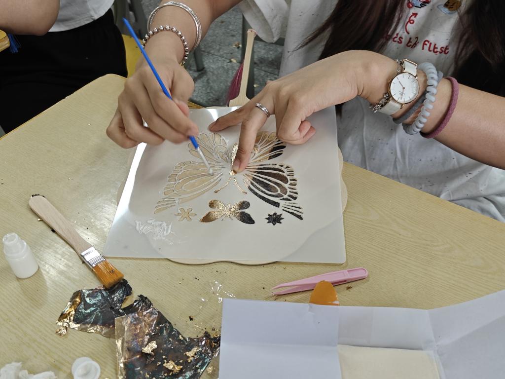 在创作实践体验环节,同学们热情高涨。活动现场提供祥云、蝴蝶、花卉等丰富线稿模板,同学们也可以自由创作。按照描稿定形、涂胶晾干、贴箔塑形、清理抛光的步骤,用细笔刷涂专用胶水,待胶水静置至明状后,小心翼翼地用镊子将箔纸轻覆于胶面,再轻轻按压贴合,最后用软毛刷扫去多余箔屑。同学们充分发挥创意,沉浸于贴箔画创作的乐趣之中。