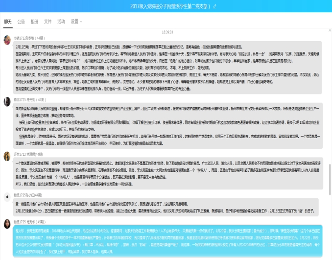 最后,胡斌同志也向全体党员、入党积极分子提出三点倡议:一是提高政治站位。科学阻击疫情,树立正确的舆论导向,学习科学防范知识,做到不信谣,不传谣;二是要发挥党员表率作用。以实际行动践行党员责任义务,积极参与志愿服务,担当作为,坚持做到守土有责、守土尽责;三是坚持以身作则。尽力减少外出活动,减少去人员密集区,注意个人卫生和防护,在家及时完成线上课程安排为返校校做好准备。努力做不负时代使命、不负党的期望、人民期待、民族重托的有理想、有本领、有担当的时代青年党员。