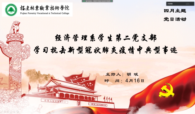 一名党员一面旗,疫情再变,初心不变。4月16日下午,经济管理系学生第二党支部(原学生第三党支部)通过腾讯会议平台开展了四月份线上主题为“学习抗击新型冠状肺炎疫情中典型事迹”党日活动。支部全体党员、入党积极分子参加了本次主题党日活动,活动由支部书记胡斌同志主持。