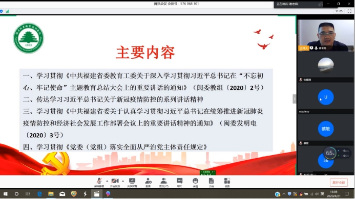 为教育系部党员同志牢记党的宗旨,增强疫情期间担当责任意识,全面了解从严治党主体责任规定,2020年4月21日下午经济管理系党总支通过腾讯会议网络平台召开2020年第4次集中学习会。本次学习活动由系党总支书记谢福荣主持,经济管理系全体党员参加学习。