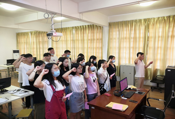 “组织入党一生一次,思想入党一生一世”。为庆祝建党99周年,过好党的生日,忆入党初心,2020年7月1日,经济管理系学生第二党支部2018级党员在经管楼502教室组织开展“重温入党誓词 牢记初心使命”的主题党日活动,支部教师党员胡斌同志带领全体党员在鲜红的党旗前,郑重的举起右手,许下铮铮誓言。“我宣誓:我志愿加入中国共产党,拥护党的纲领,遵守党的章程,履行党员义务,执行党的决定,严守党的纪律,保守党的秘密,对党忠诚,积极工作,为共产主义奋斗终身,随时准备为党和人民牺牲一切,永不叛党。”