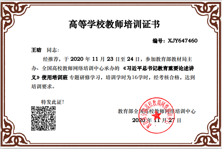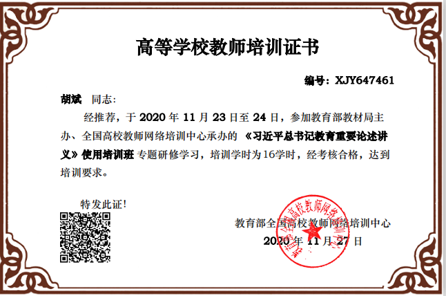 此外,为深刻领会、准确把握习近平总书记关于教育的重要论述,进一步推进习近平新时代中国特色社会主义思想“三进”,2020年11月23日至24日,支部教师党员一同参加教育部教材局组织的《习近平总书记教育重要论述讲议》使用网络培训班并顺利通过考核。
