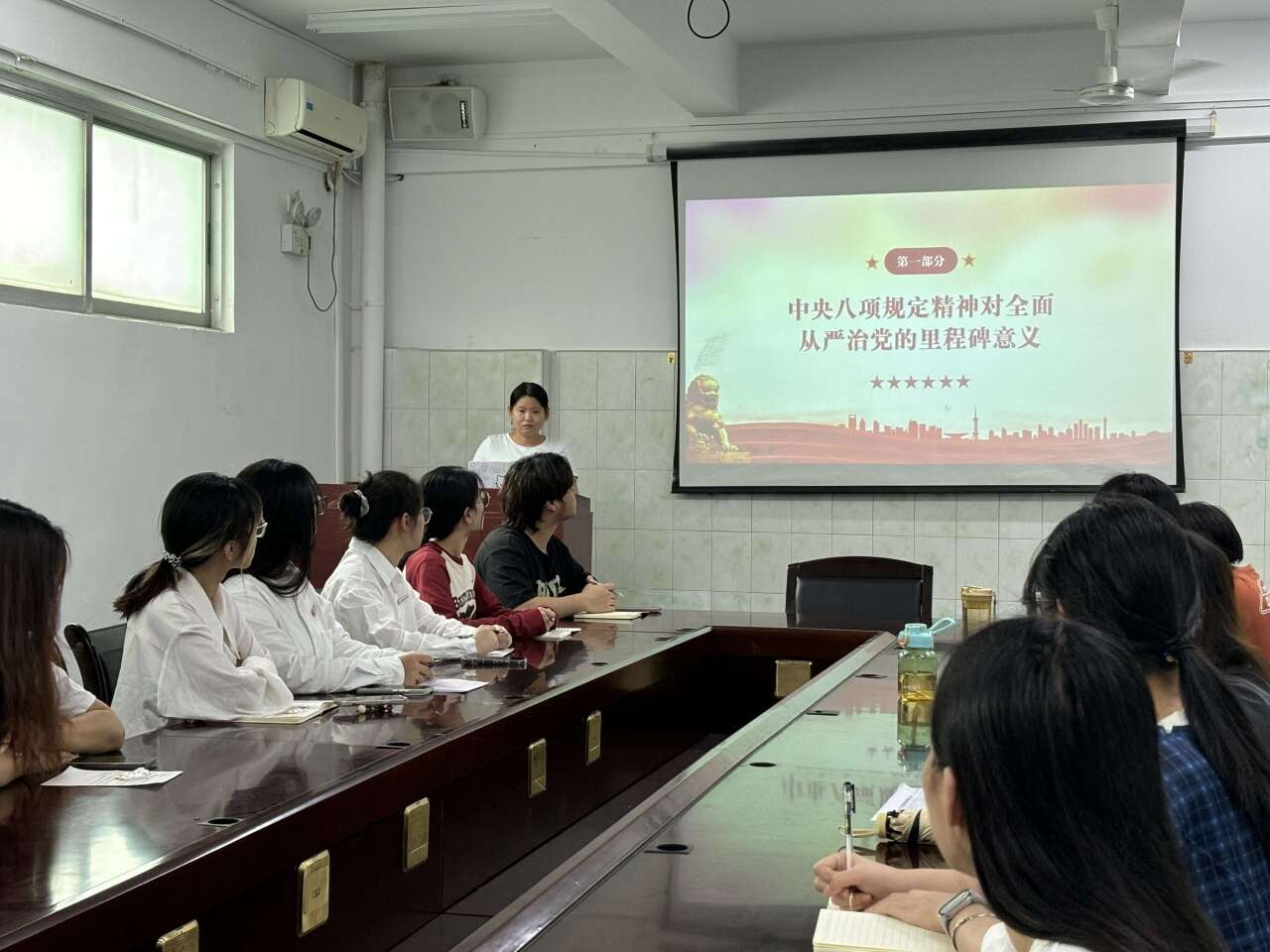 党课上,支部书记卢彦铭首先详细阐述了中央八项规定精神对全面从严治党的里程碑意义。她指出,中央八项规定的出台,是新时代推进全面从严治党的重要起点和有力抓手,全党全社会形成了风清气正的政治生态和社会风尚。接着她从历史和现实相结合的角度,深入剖析了八项规定的核心内涵与时代价值。她指出中央八项规定精神是应对新形势下各种风险挑战的必然要求,是保持党的先进性和纯洁性的重要保障,是实现中华民族伟大复兴中国梦的强大动力。最后她对全体师生党员提出了明确要求。师生党员作为青年中的先进分子,要深刻认识到自己肩负的责任和使命,自觉将中央八项规定精神融入到学习、生活和工作中。