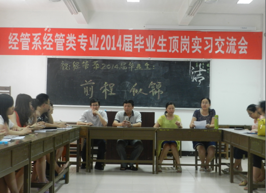 6月17日下午,经管类专业2014届毕业生顶岗实习交流会在实训楼201召开。经管教研室全体教师及毕业生代表共30余人参加了交流会。会议由经管系教研室主任刘紫青老师主持。