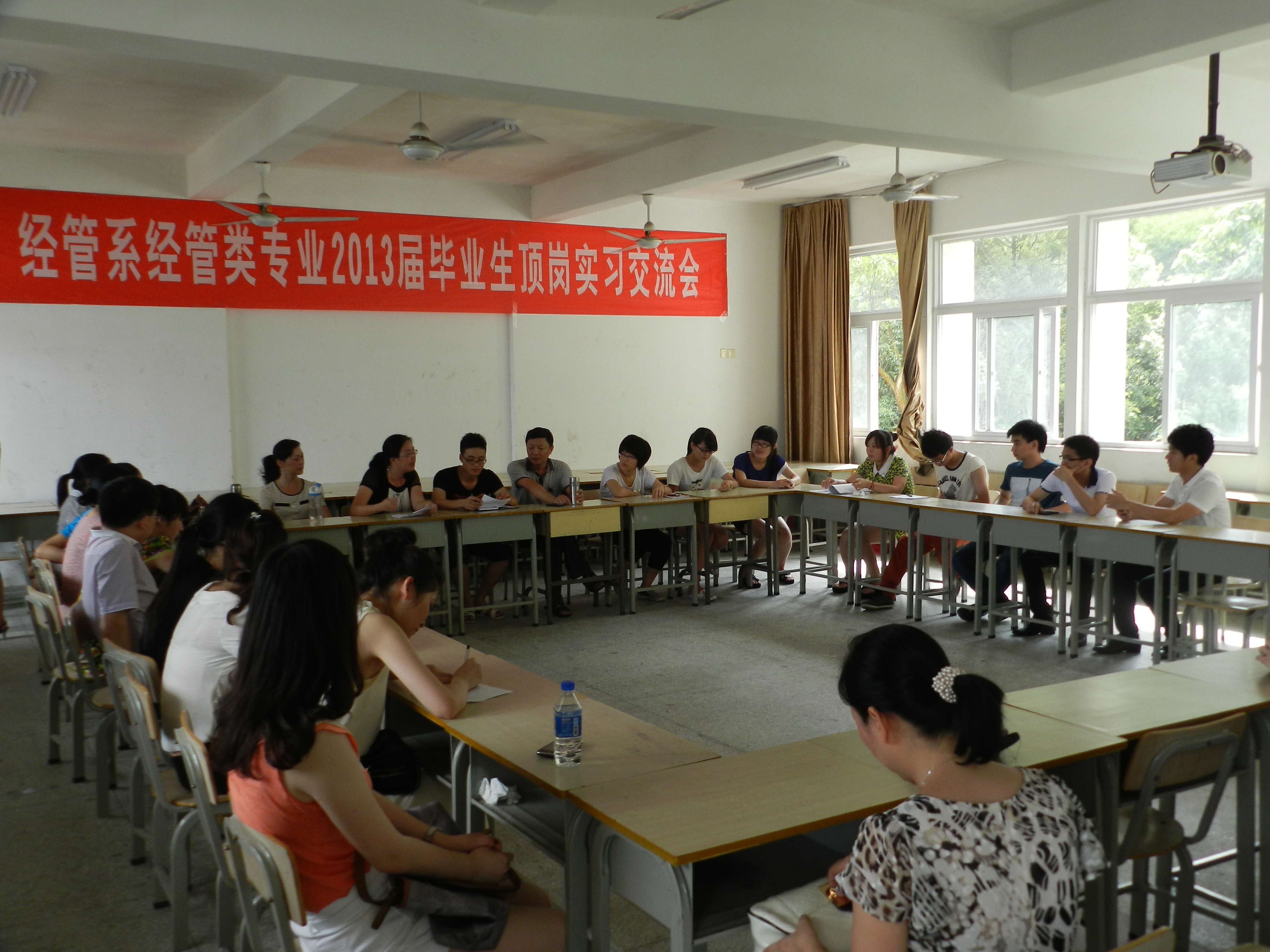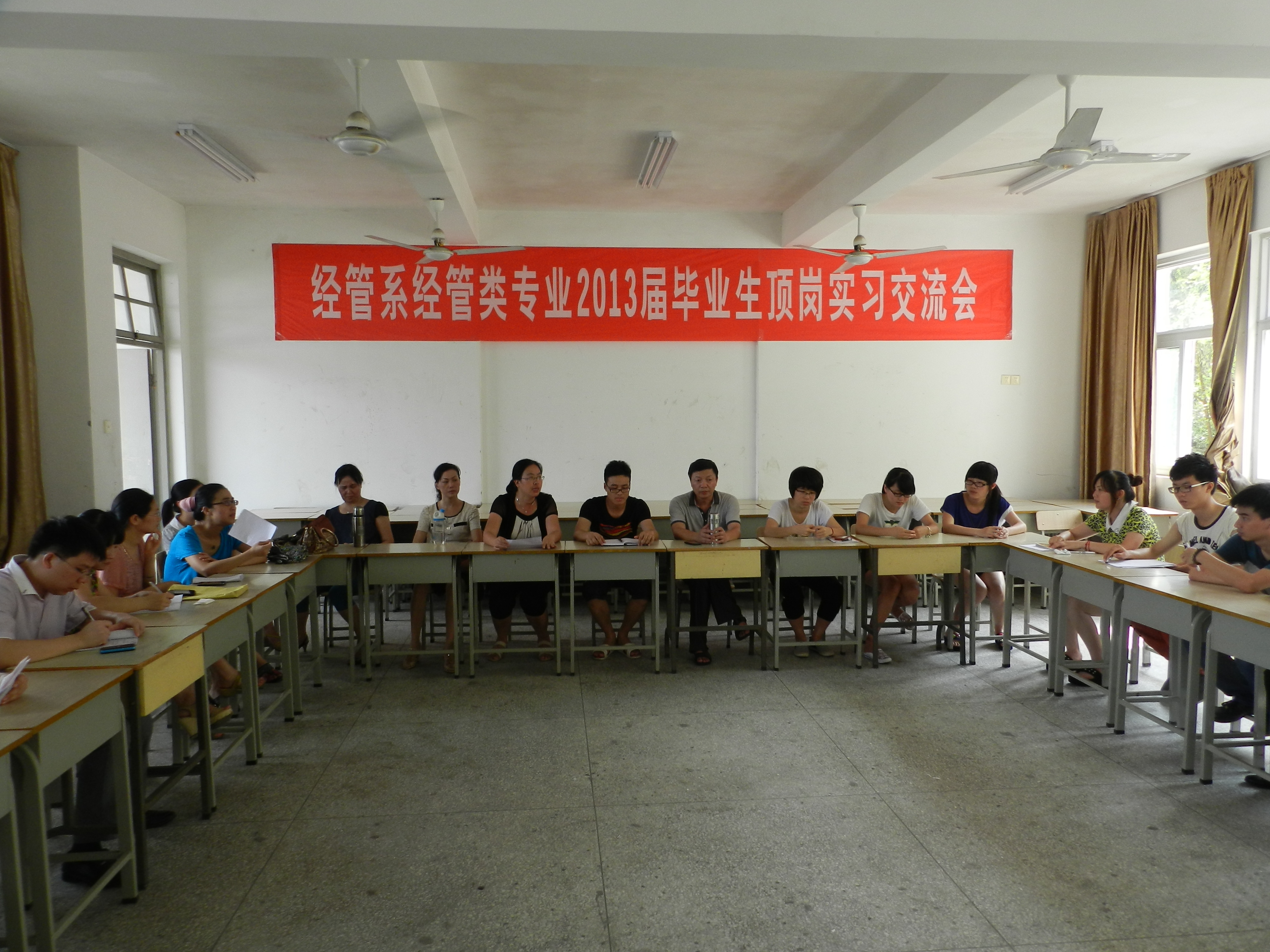 6月18日下午,经管类专业2013届毕业生顶岗实习交流会在科教楼505召开。经管教研室全体教师及毕业生代表共30余人参加了交流会。会议由经管系教研室主任刘紫青老师主持。