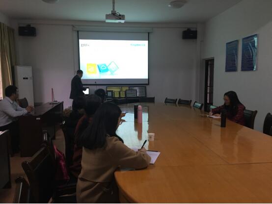 由吴淑秋老师联系的金蝶公司代表以PPT演示方式着重介绍了K/3 WISE“ERP+”产品解决方案和快递“100”。演示结束后,各位老师就各自的问题和要求向金蝶公司代表进行发问,宋李玉、吴淑秋等老师也就此提出了建议。教研室主任张秀媚老师对金蝶公司代表的演示表示了感谢,同时希望能为同学们找到真正实用且利于教育学习和实操技能培养的好工具。