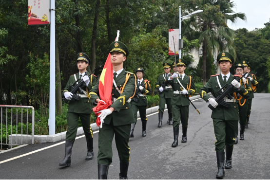 党委书记万泉为天麟校区军训连授旗,党总支书记陈友益老师接旗,向全场挥旗致意。