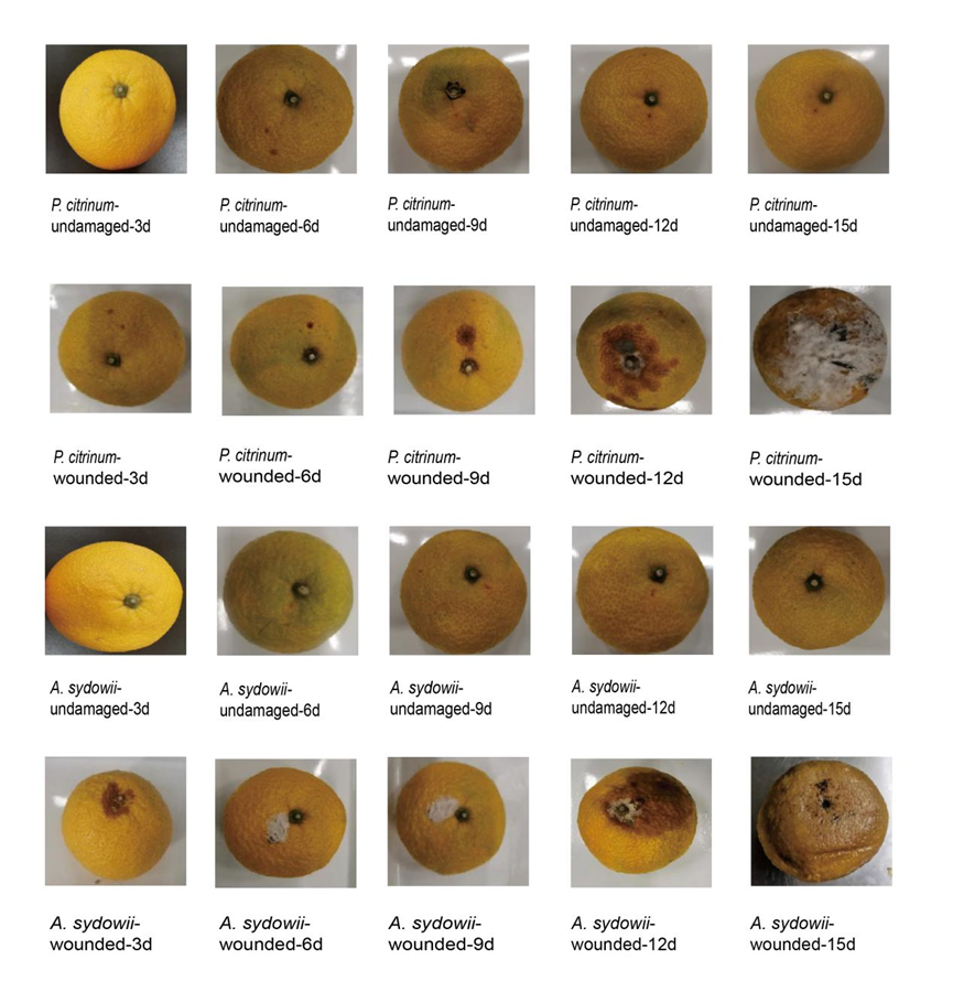 Fig. 5 Symptoms of tangelo fruits inoculated with two kinds of pathogens