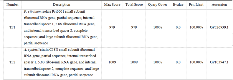 Table 1 The sequence identification information of pathogenic fungi was carried out on NCBI.