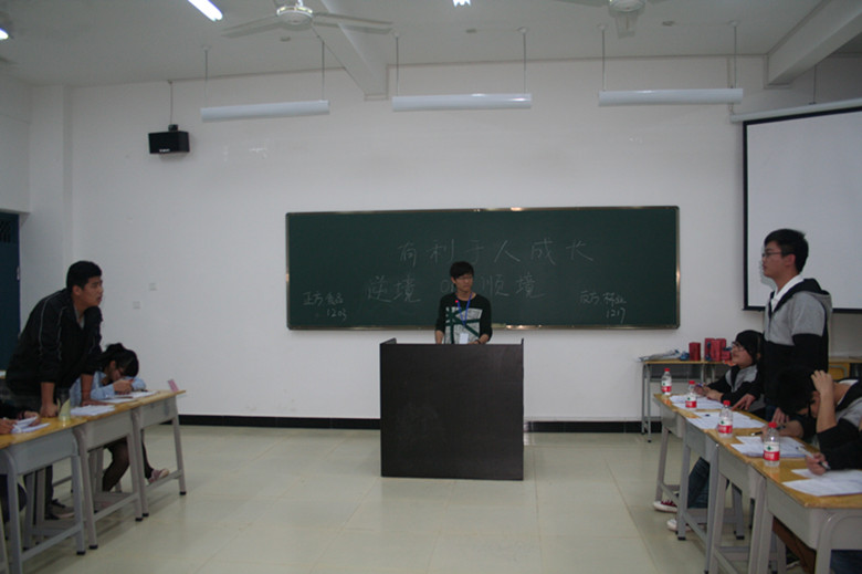 双方围绕“逆境有利于人的成长还是顺境有利于人的成长”展开激烈交锋。面对正方食品1203的引经据点,旁征博引,反方林业1216的辩手们巧用“四两拨千斤”的方法,一如既往用风趣的言语冷静应对,一次次化险为夷。其中,反方三辩吴天福同学,他思路清晰、言语幽默,给笔者和许多观众留下深刻印象,实至名归获得本场“最佳辩手”称号。在激烈的言辞对决后,林业1216在本场比赛中赢得最后胜利,食品1203的选手们则主动与对手握手祝贺,辩手们良好的心态和绅士风度也获得评委与观众的一致肯定。