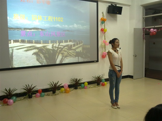 资环系于5月13日晚上,在实训一409导游实训室举办第六届校园导游风采大赛决赛。大赛中,选手们给我们展示了各地的风景,还有各种的才艺,如:小品,唱歌,舞蹈,武术等等。本次大赛有11人获奖。一等奖:旅游1105,韩阳;二等奖:生物1108,朱博蔚;旅游1105,傅丽娟;三等奖:旅游1105,郑慧玲,叶婷婷,杨佳烨;优秀奖:旅游1105,杨丹青,丁吓妹,陈麟蕾,林艺娜;园林工程1102,彭华敏。