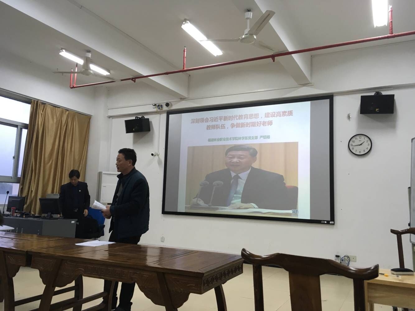 2018年12月27日下午16时,于江南实训一409,我系开展林 “深刻领会习近平新时代教育思想,建设高素质教师队伍,争做新时期好老师”专题党课,此次专题党课我系荣幸邀请到严绍裕副院长主讲,全体师生党员共同参与学习,会议由党总支书记吴奇镇主持。