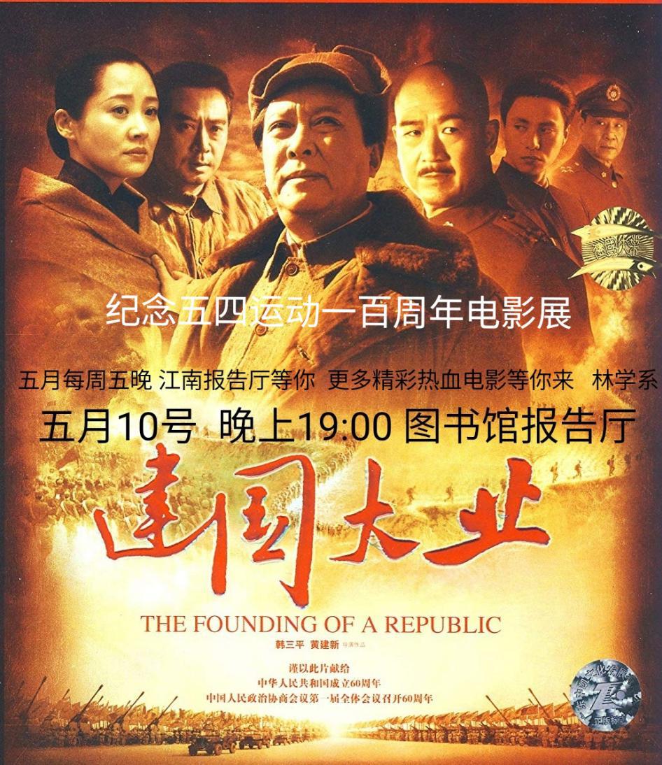 5月10号晚上19点江南图书馆播放纪念五四运动一百周年主题电影:《建国大业》,影片讲述了从抗日战争结束到1949年中华人民共和国建国前夕发生的一系列故事。中国共产党和中国各民主党派在反对蒋介石国民党独裁统治的斗争中,和衷共济、团结奋斗,为建立多党合作和政治协商制度所经历的曲折艰辛直至取得最后胜利的光辉历程。让广大师生回顾先辈的光辉历史,知晓今日生活来之不易。