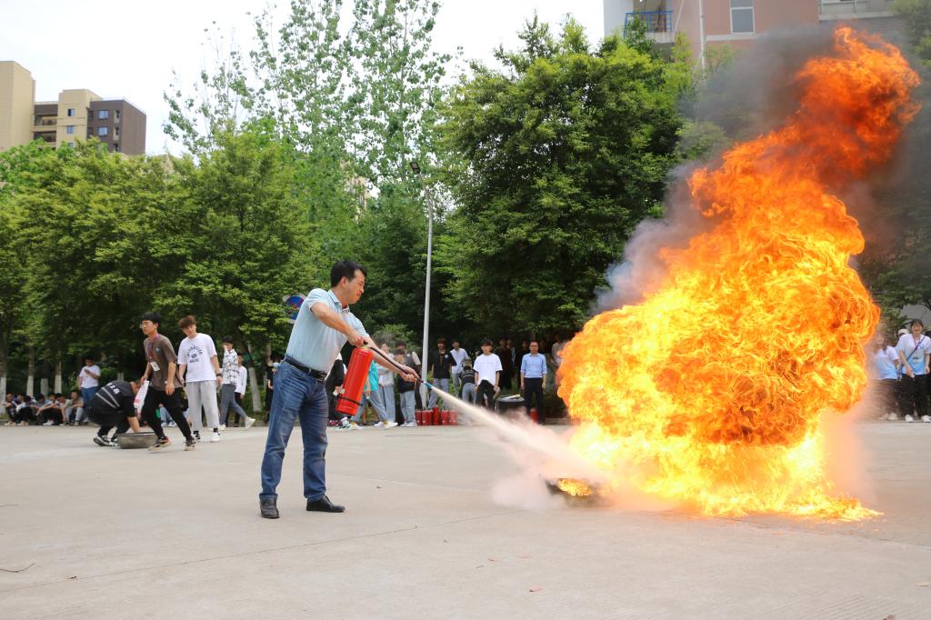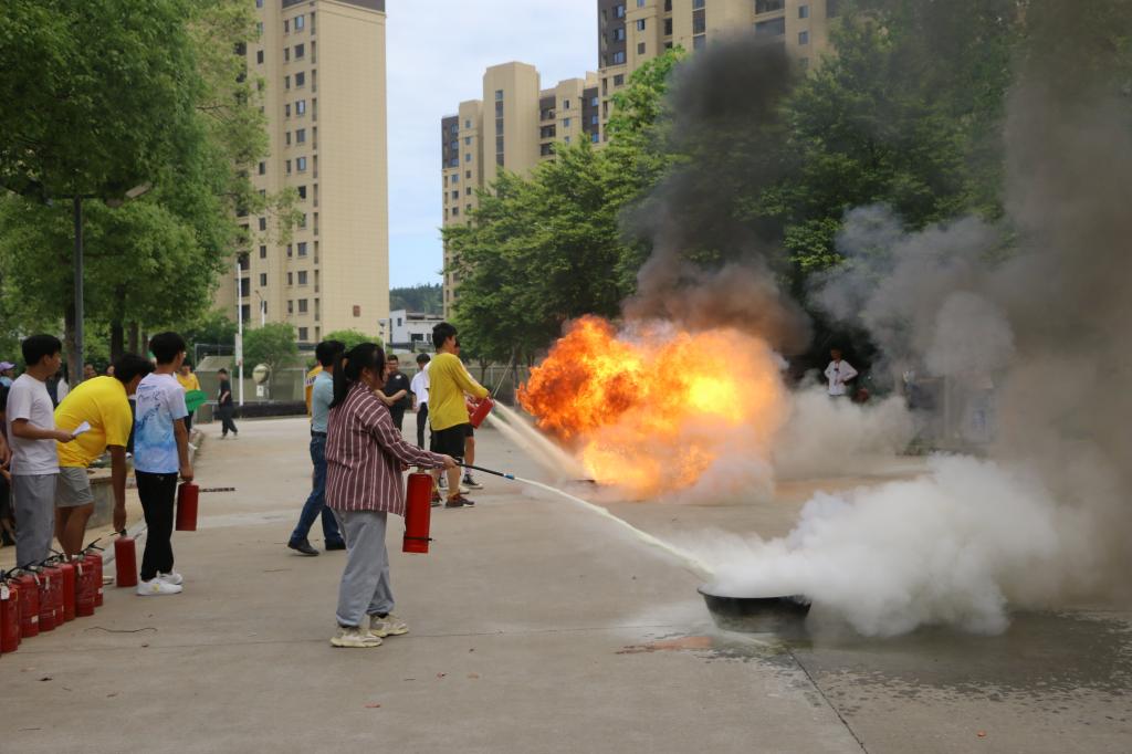 最后,工作人员又组织全体同学到实训四大厅前,学习灭火器的使用方法。