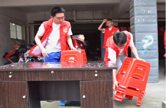 “小林员”们协助社区布置活动现场,并将准备好的糯米、粽叶等整齐地摆放在桌子上,以确保活动有序顺利开展。