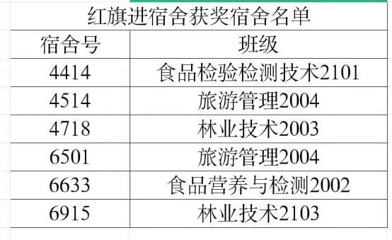 为加强林学系学生宿舍管理,创建安全文明卫生的学习生活环境,促进学生综合素质的提高,展现当代大学生的良好形象,营造健康、多彩的寝室文化氛围。林学系宿管部、女生部根据平时对女生宿舍六号楼和男生宿舍四号楼的卫生检查情况,进行了11月份的优秀寝室评比,并由辅导员为优秀寝室颁发了流动红旗。