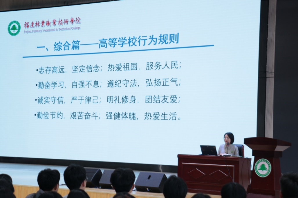 学生科科长马艳红向同学们详细介绍了校纪校规、学生管理制度、高等学校学生行为准则,让同学们明纪律、知敬畏、守底线,共同营造一个良好的学习和成长环境,培养自身的品德素质和社会责任感。