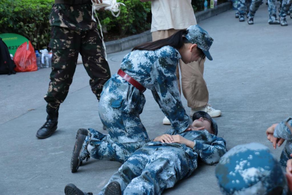教官向同学们介绍了外伤包扎的具体步骤。用三角巾和绷带为同学们展示了骨折固定、头部受伤等多项伤情包扎技术以及心肺复苏的具体流程,使同学们进一步了解了急救技能。为了让大家进一步掌握急救技术,教官让同学们自行练习包扎,并邀请同学进行心肺复苏的练习。对动作不规范、操作流程不正确等问题进行了纠正,使同学们对于急救技能有了更牢固的掌握。