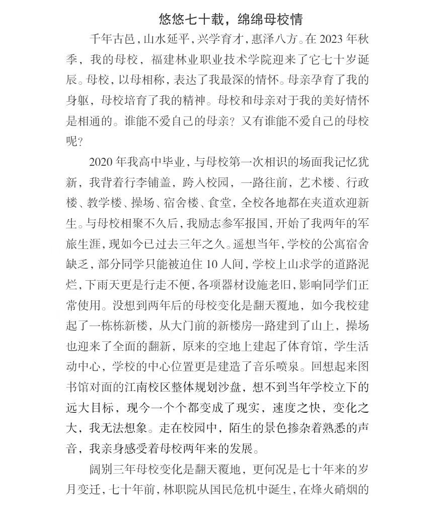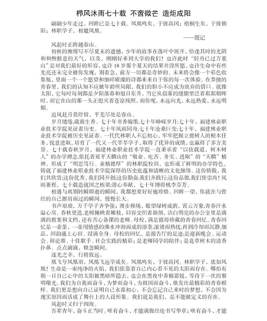 征文活动的主题将紧密围绕“我们的母校、我们的回忆、我们的未来”,鼓励参与者表达对学校七十年发展历程的独特见解、对学校精神的理解、对未来发展的展望,或是回顾自己的成长与学习经历。在培养写作能力和凝聚全校师生的热情的,共同庆祝这一特殊时刻。以下是本次比赛的获奖作品。