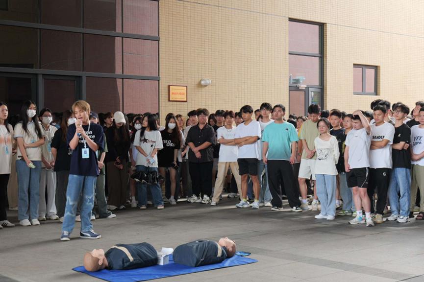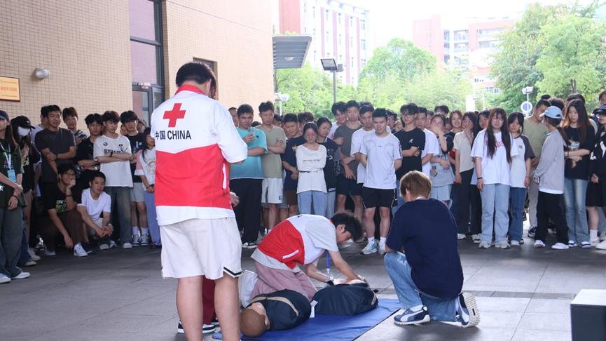 在图书馆门前,院红十字会成员向大家示范急救方法,并讲解疾病突发情况下如何有效救援,同学们积极参与学习。