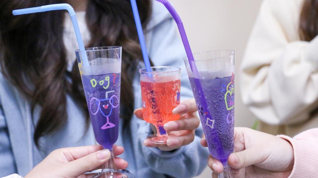 活动开始先在签到处领取一个酒杯后,大家根据自己的喜好进行绘画,最后来到签到处第一间进行调酒,将不同种类的酒、果汁、汽水、糖浆等按一定比例混合,摇曳着冰块,碰撞出一杯杯混合着浓郁果香和独特酒香的调酒作品。