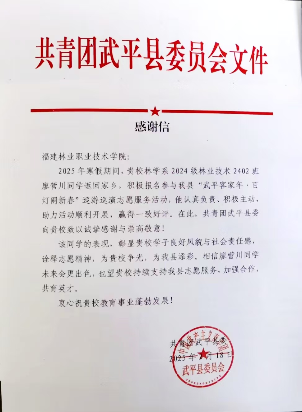 为深入学习贯彻习近平新时代中国特色社会主义思想,加强自身综合实践能力,锤炼顽强奋斗品格。福建林业职业技术学院林学系林业技术2402班廖营川于2025年寒假期间积极参与各类社会实践活动,用自己的实际行动诠释了当代青年的责任与担当。