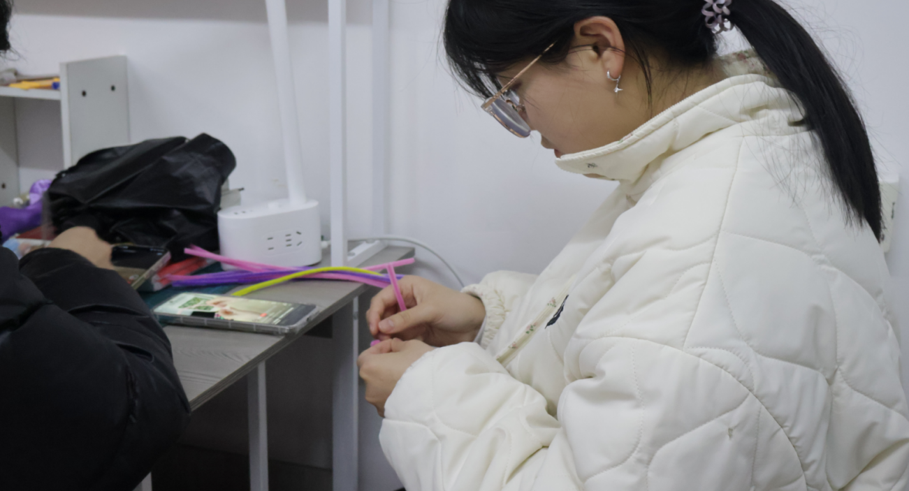 活动伊始,同学们纷纷拿出手机,迅速搜索扭扭棒制作教程。认真学习一番后,同学们便围坐在一起,兴致勃勃地开启了扭扭棒工艺品的创作之旅。制作过程中,每一位同学都全神贯注,沉浸在手工创作带来的乐趣之中,只专注于将手中色彩斑斓的扭扭棒,精心塑造成一件件独具匠心的作品 。