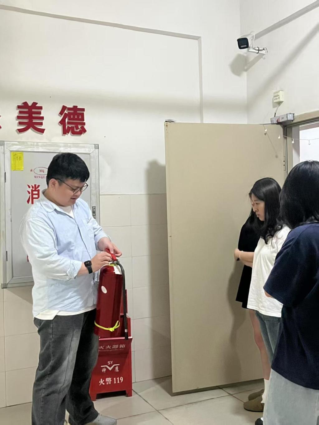 此外,为强化学生消防安全意识,提升应急自救能力,专职辅导员王玮琪老师为同学们讲解了灭火器规范操作方法。并严谨演示如何通过压力指示器判断设备状态、根据火源类型调整喷射距离及站位方向。同学们通过理论与实践相结合,掌握了灭火器实操技能,增强了消防安全意识与应急处突能力,为生命安全筑牢坚实防线。
