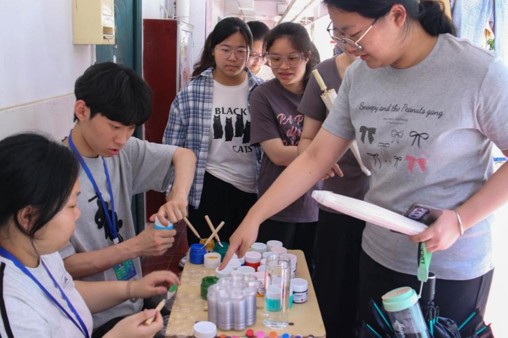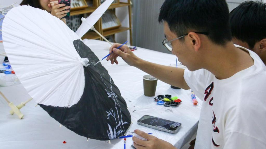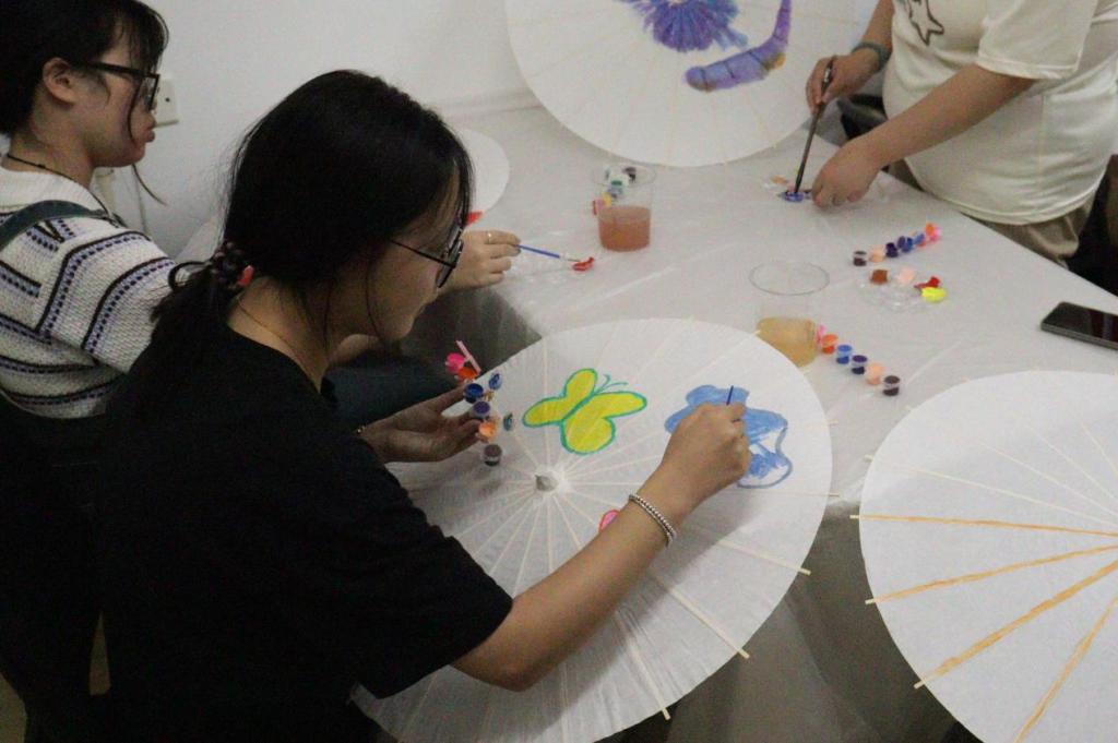 活动现场,同学们领取颜色盘、纯白油纸伞,挑取自己喜爱的颜色与图案,在油纸伞上进行绘制,每一处颜色都蕴含着同学的欢喜和用心。同学们近距离触碰油纸伞,感受传统工艺的细腻与复杂。
