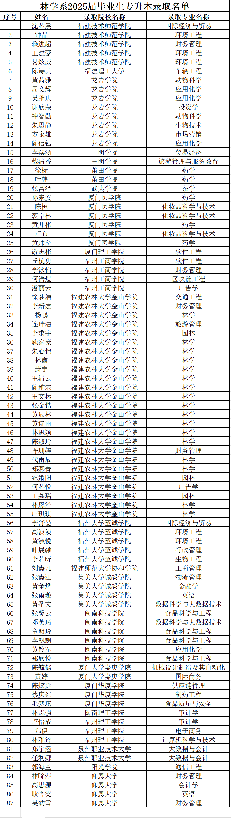 同时,也希望在校学子以这些优秀学长学姐为榜样,树立清晰目标,珍惜学习时光,勤奋刻苦,脚踏实地。期待未来,你们也能在专升本考试中崭露头角,为林学系续写新的辉煌!