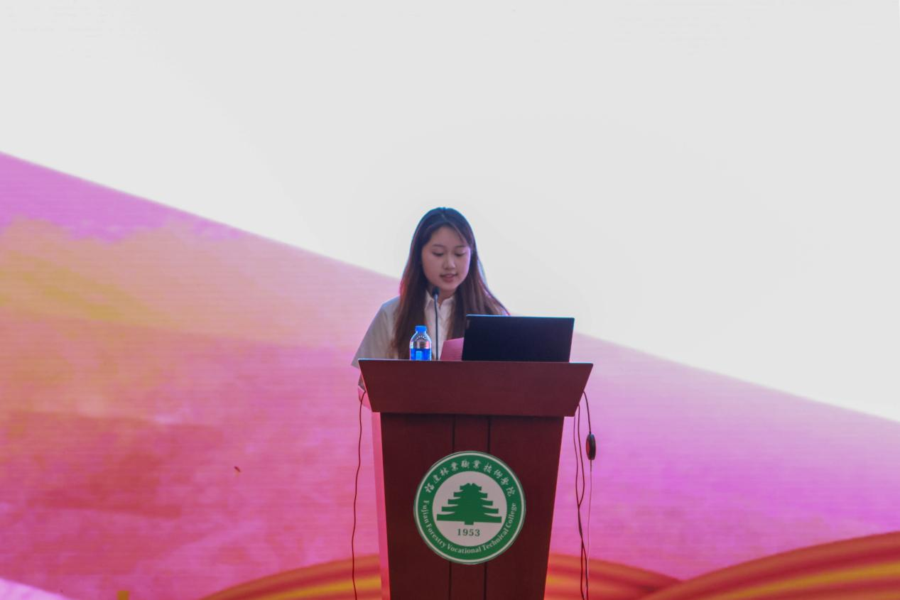 第三项议程由我系学生代表林偲怡同学发言。她分享了自己从初次参赛的紧张到后来从容应对的心路历程,用"坚定信念、迎难而上、持之以恒"三个关键词概括了参赛心得。最后她鼓励同学们珍惜此次机会,勇于挑战自我,号召同学们以青春奋进,以技能筑梦。