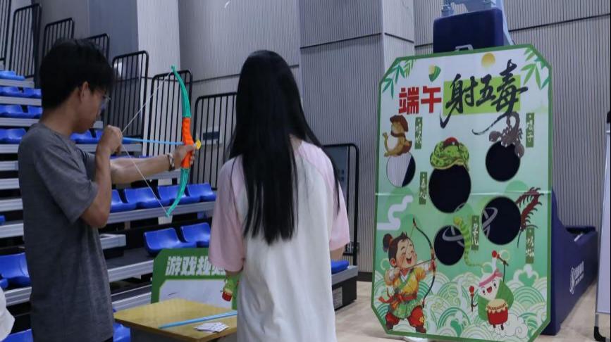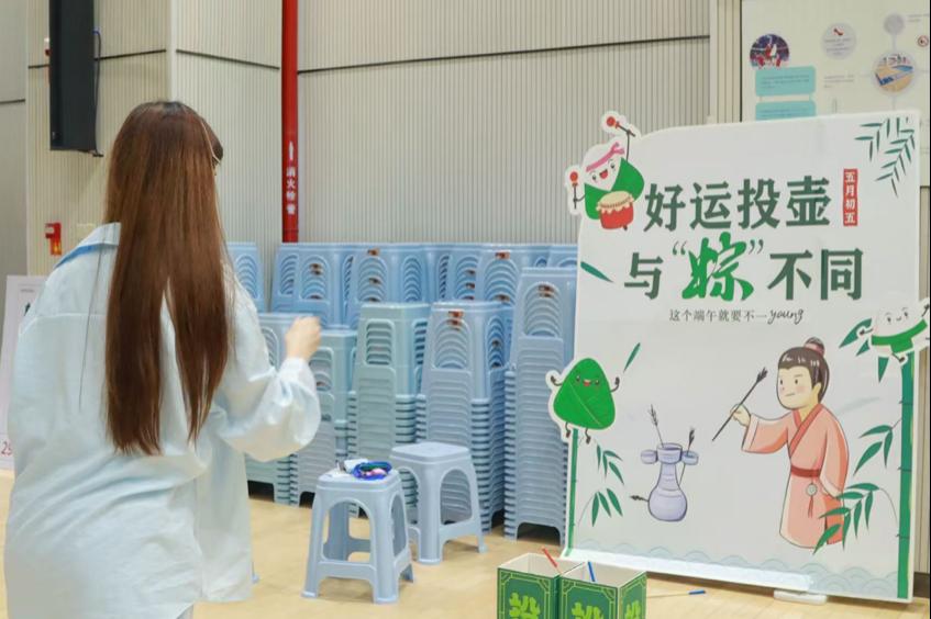 走进游园会现场,欢声笑语不绝于耳。“好运投壶与‘粽’不同”,投壶区里,大家手持箭矢,屏气凝神,瞄准壶口,在传统游戏中感受古人的雅致情趣;“端午射五毒” 处,参与者们张弓搭箭,向着代表 “五毒” 的靶子进发,寓意驱邪祈福;还有 “独乐乐不如粽乐乐” 钩粽子和“端午圈粽你”趣味游戏,大家在轻松愉快的氛围中,尽情享受游戏的乐趣,重拾童年的欢乐。
