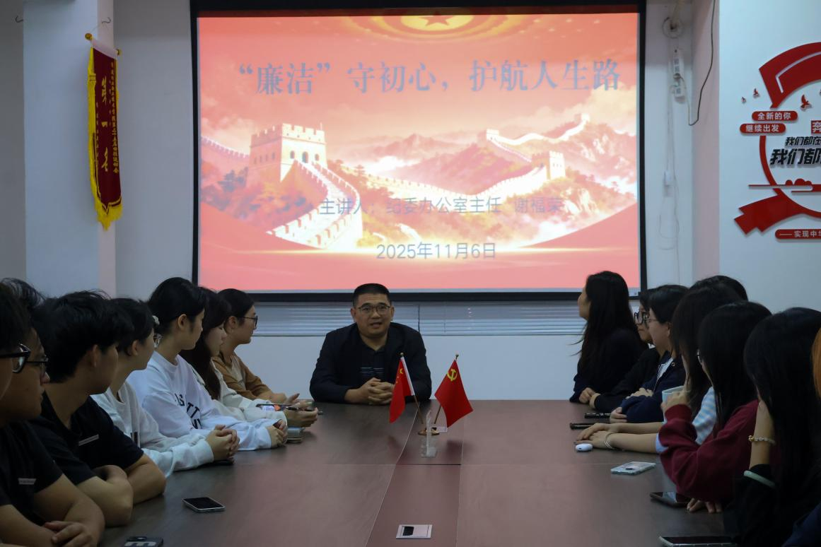 谢福荣老师打破“廉洁是遥远口号”的固有认知,用通俗生动的语言阐释廉洁的深刻内涵。他强调,廉洁是守住原则的底线,是拒绝贪念的清醒,更是身处任何岗位都“心有所畏、行有所止”的自觉担当。针对学生干部群体,他特别指出,学生干部作为校园管理与服务的骨干力量,其廉洁素养直接影响校园风气建设。在评优评先中坚守公平公正、在社团管理中恪守财务透明、在服务同学中杜绝特权思想,这些看似细微的举动,都是学术诚信与岗位廉洁的具体践行,更是对青春初心的珍视与守护。