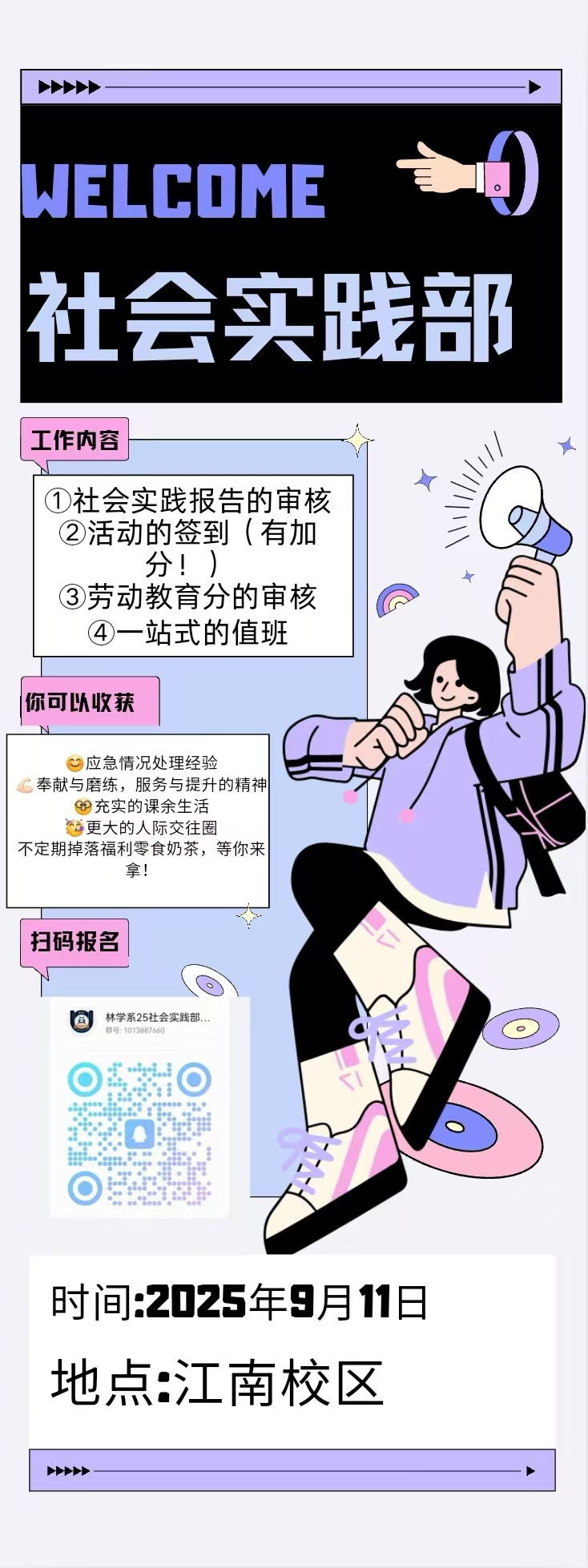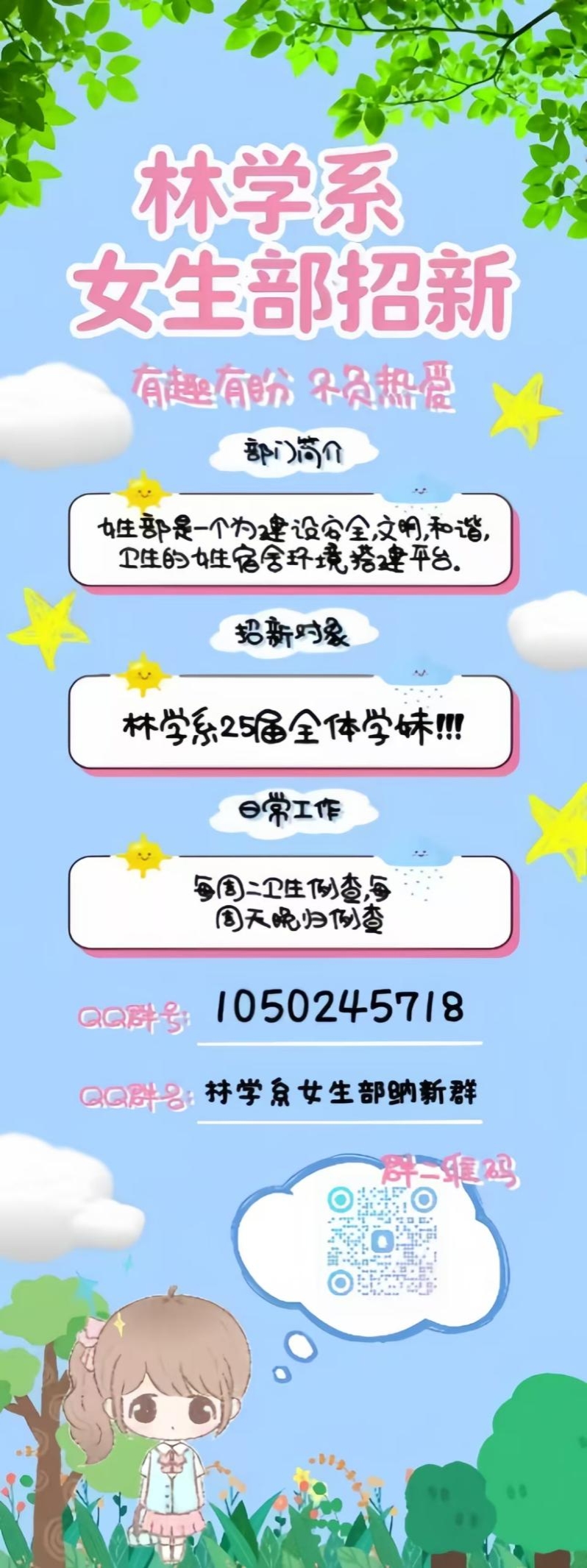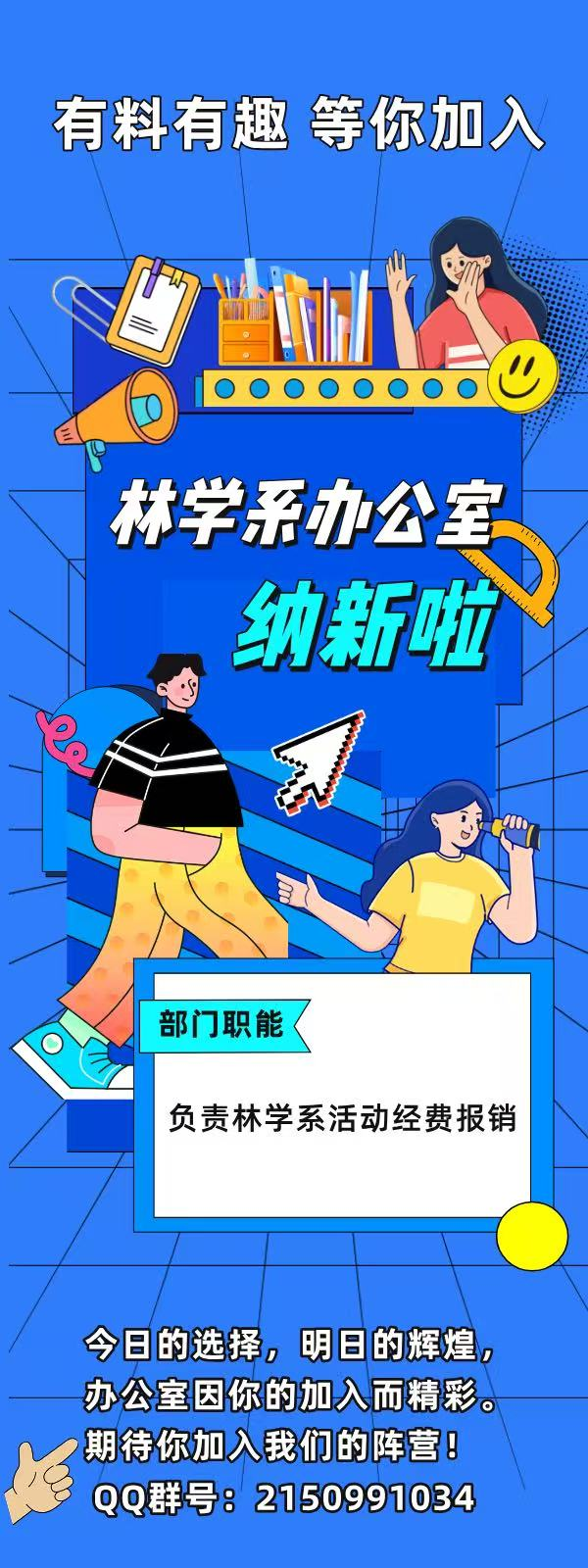 林学系九月藏惊喜,两委会纳新正等你!别让校园时光留白,林学系两委会各部门已就位。这里不只是一个学生组织,更是你校园生活的“加分项”,是你成长路上的“助推器”。别犹豫,趁青春正好,来两委会找到属于你的位置,让校园时光因奋斗而充实,因热爱而闪耀!