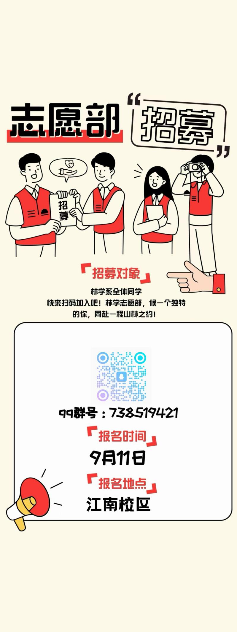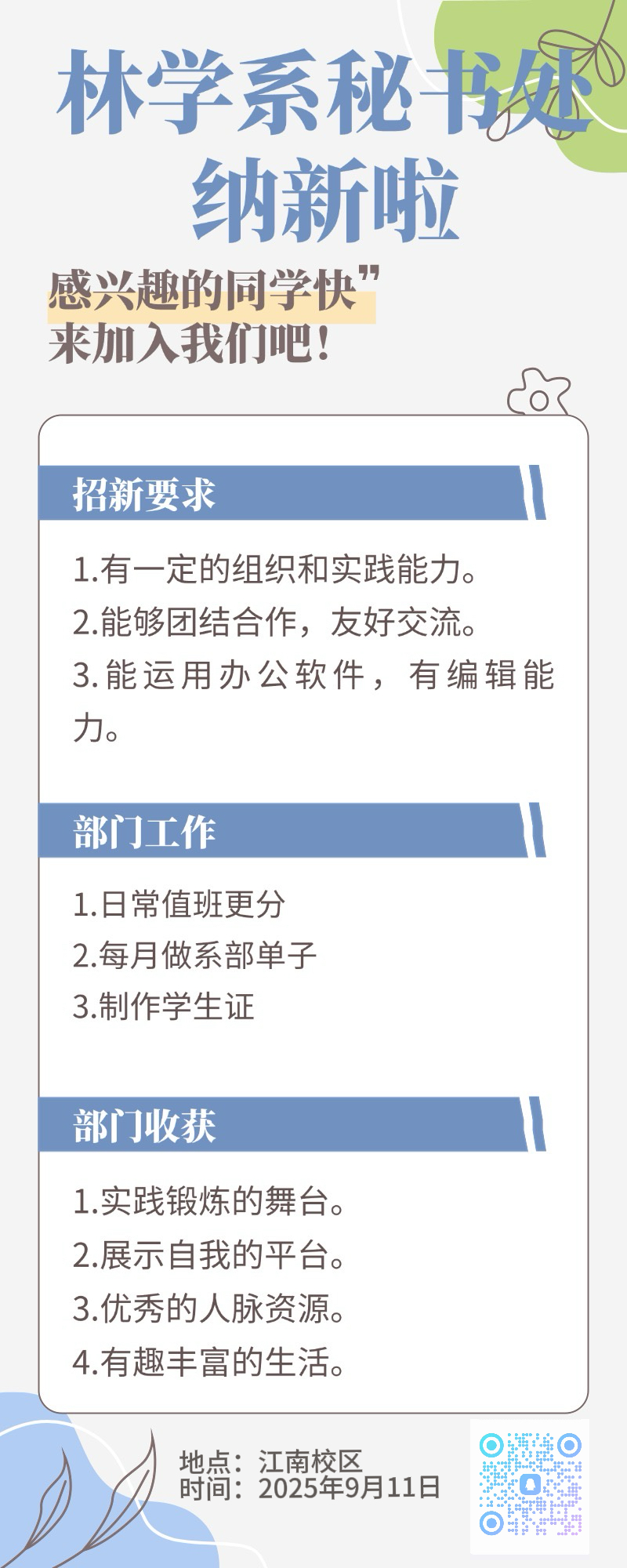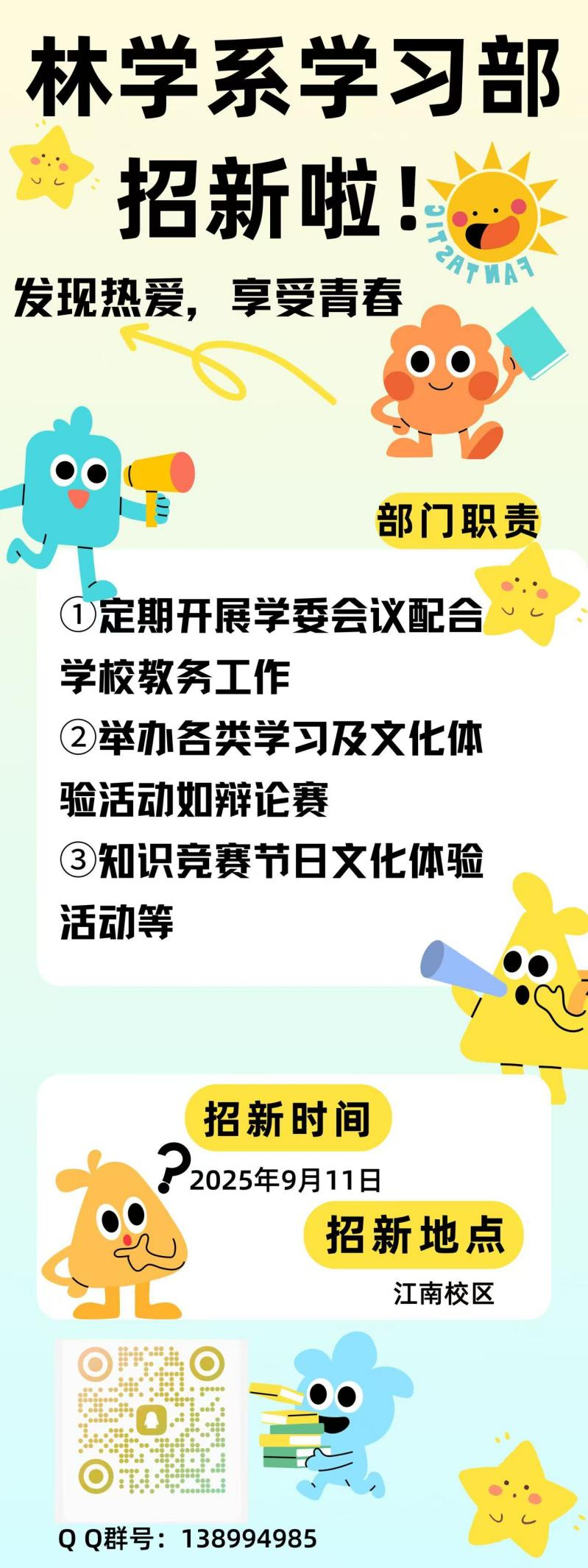 林学系九月藏惊喜,两委会纳新正等你!别让校园时光留白,林学系两委会各部门已就位。这里不只是一个学生组织,更是你校园生活的“加分项”,是你成长路上的“助推器”。别犹豫,趁青春正好,来两委会找到属于你的位置,让校园时光因奋斗而充实,因热爱而闪耀!