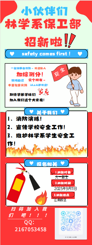 部门介绍:林学系保卫部是维护林学系学生安全的重要学生组织。部门职责为负责宿舍突击检查、晚归管理、突发事件处理等日常工作,定期开展安全教育宣传、消防演练等活动,配合学院做好安全防范工作,全力为同学们营造安全和谐的学习生活环境。
