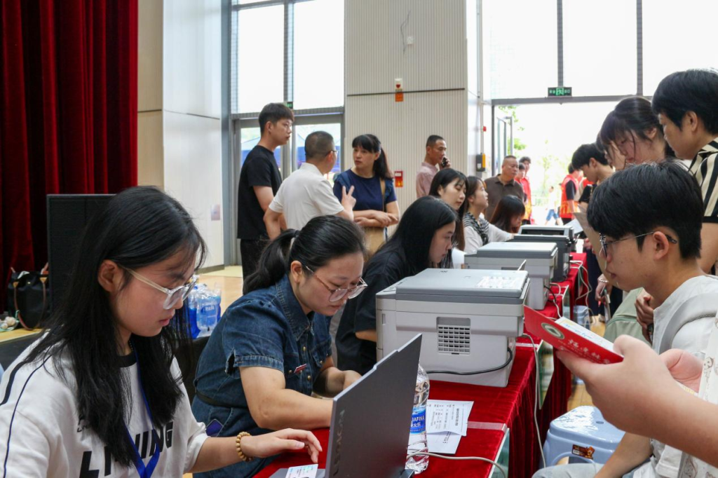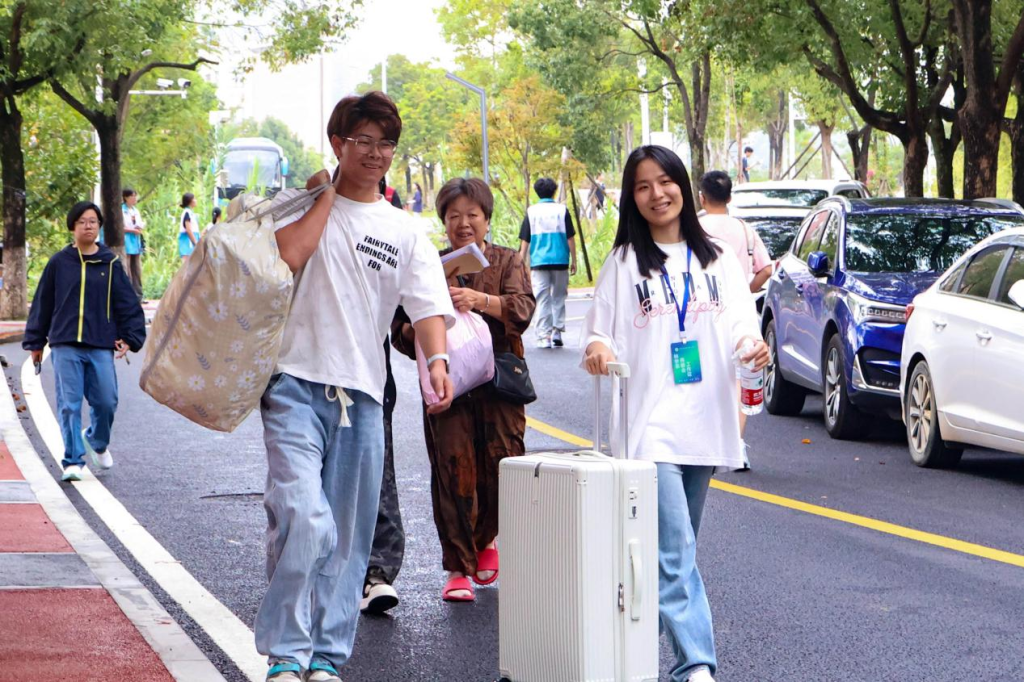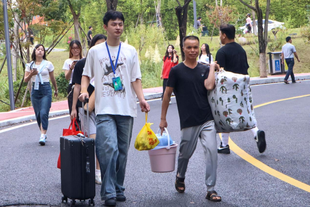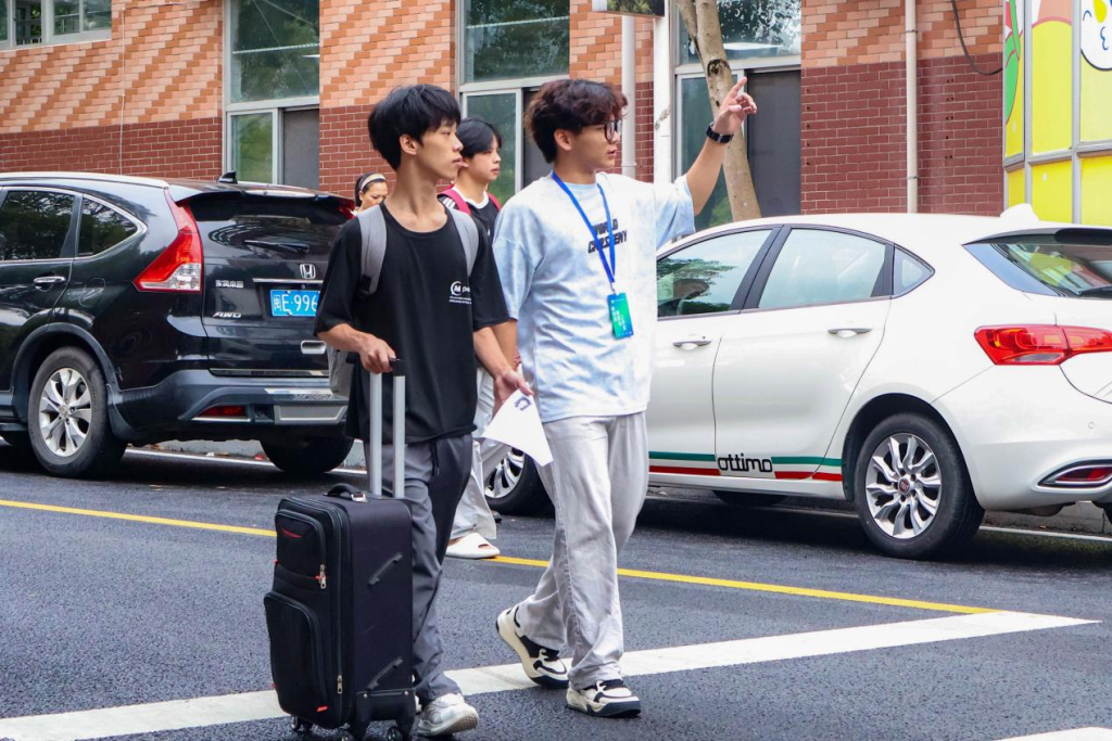接下来便是萌新们心心念念的宿舍区域了,在宿舍楼下。学姐学长们早已经整装待发,为迎接新生做好充分的准备。他们接过新生的行李,带领着新生们找到将度过三年时光的“小家”。