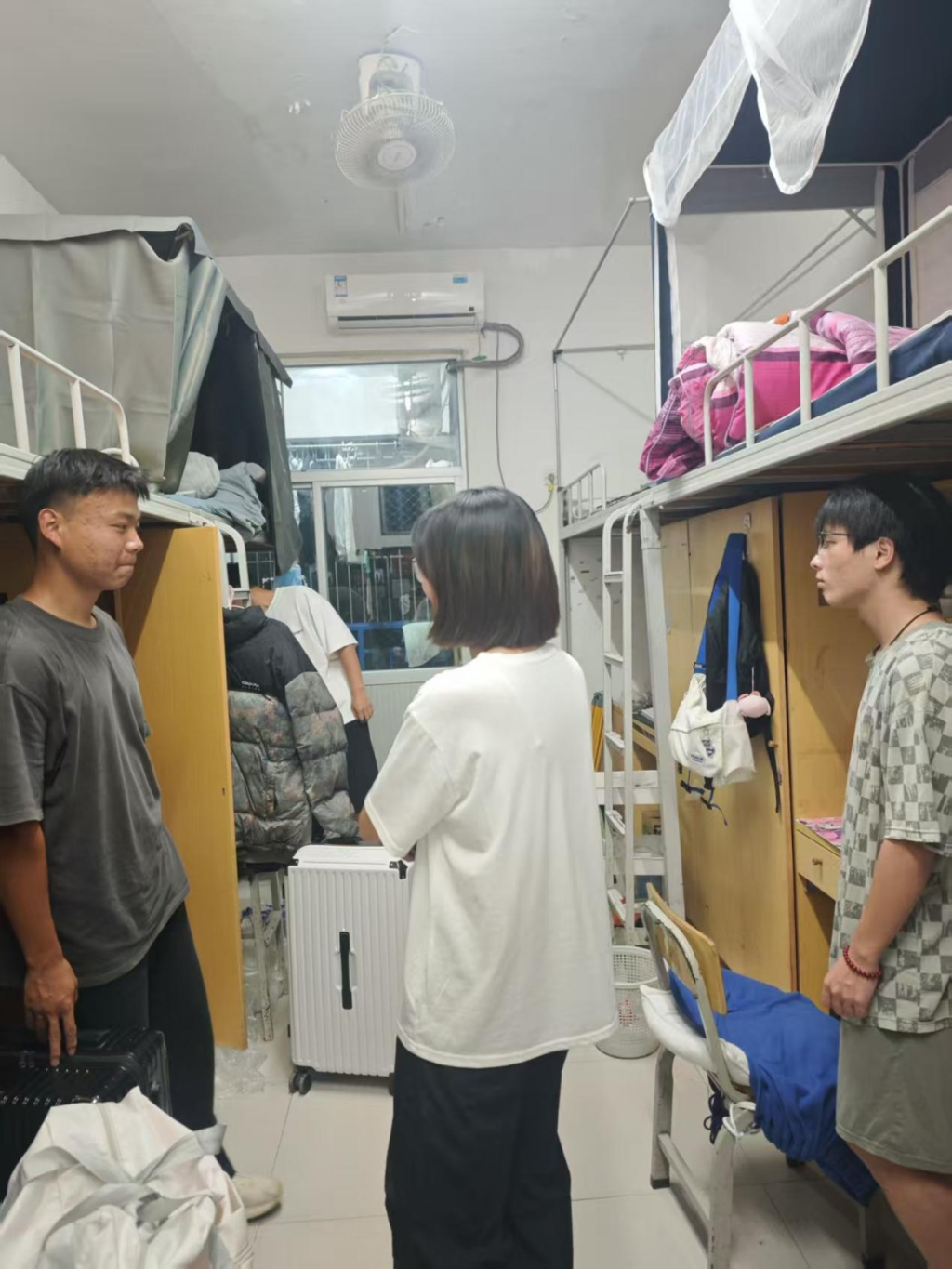 李肇锋副院长与系领导们轻步走进新生宿舍,每到一间宿舍,都主动与新生亲切问候,详细询问同学们从家乡来校的行程是否顺利、行李物品是否安置妥当、住宿环境是否习惯、生活需求是否得到满足。“宿舍空调制冷效果怎么样?”“和室友们相处得还融洽吗?”“有任何问题随时找辅导员或系里沟通,我们会尽力帮大家解决。”一句句关切的询问、一声声温暖的叮嘱,瞬间拉近了与新生的距离,让初入校园的同学们感受到了家一般的温暖。