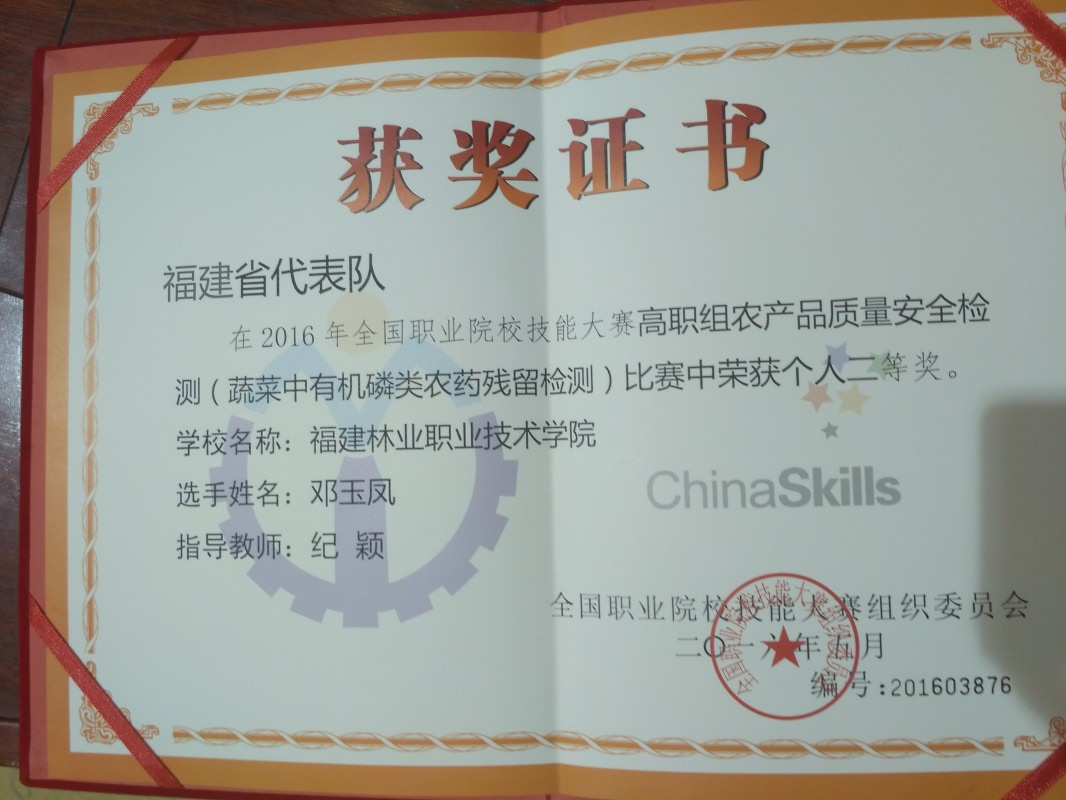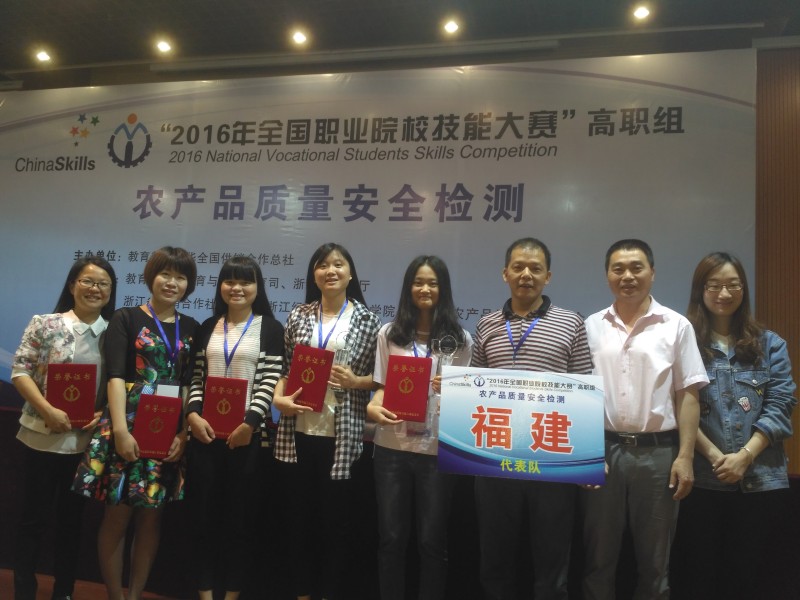 5月23日经过三天紧张的比赛,在2016年全国职业院校技能大赛高职组农产品质量安全检测类三个赛项中:蔬菜中有机磷类农药残留的检测、畜禽中氟喹诺酮类兽药残留的检测、茶叶中重金属含量检测。我院3名同学作为省赛优秀选手代表福建省参加了本次大赛。经过现场操作、第三方检测、上机测量、数据处理等四个环节的激烈角逐,最终曾友华同学获得“茶叶中重金属含量检测”一等奖,韩丽萍同学获得“畜禽中氟喹诺酮类兽药残留的检测”一等奖,邓玉凤同学获得“蔬菜中有机磷类农药残留的检测”二等奖。我院纪颖老师被评为优秀指导教师。