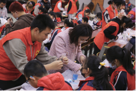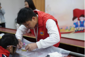 志愿者们指导小朋友们制作叶脉书签