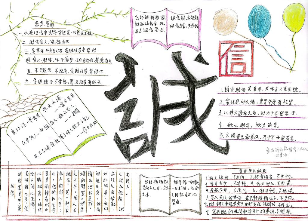 马艳红老师组织食品药品监督管理2201和2202班的同学们开展了诚信手抄报活动。手抄报中同学们抄录了有关“诚信”的名人名言,阐述了诚信的重要性、如何做到诚信,国家资助对贫困同学的帮助,也表达了同学们对国家资助政策的感恩。