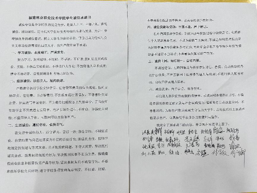 陈瑞玮老师向班级同学发起了“诚信承诺书”签名活动,呼吁新时代青年学生将诚信精神内化于心、外化于行,培养同学们诚实守信的道德品质。全体同学都有很深的感悟,纷纷签字响应,庄严承诺提升自身诚信的意识。