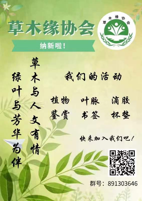 林学系草木缘协会简介:如果治愈有颜色,那一定是少不了绿色,植物是我们生活中最好的伙伴,让我们感受到大自然的温暖和关怀。大自然渴望着新鲜露水的滋养草木缘协会盼望着与你们的相遇,与花草为伙,感受自然的美好,与树木为伴,探索自然的神秘。摩挲枝叶的经脉感受大自然的美妙,我们一起将大自然赠予的美丽留存,动手为平淡亦或是忙碌的生活增添乐趣。林学系草木缘协会期待着你们的到来!