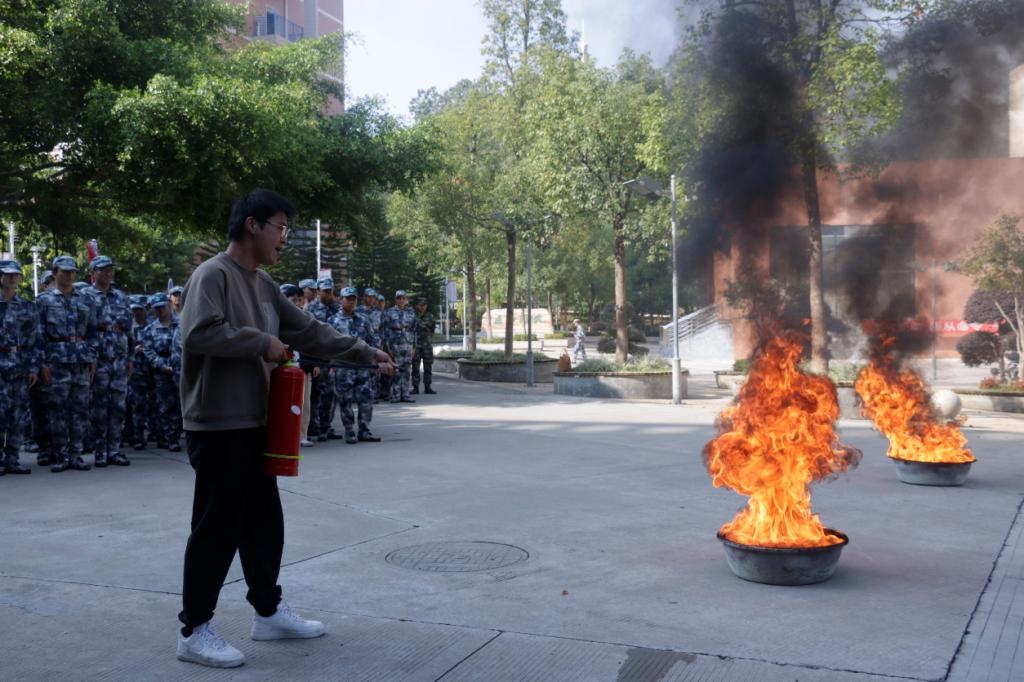 紧急逃生结束后,参训新生前往指定地点进行消防演练。安保处负责老师现场示范如何正确使用灭火器,给新同学们上了一堂实用的安全技能课。通过老师的生动讲解和规范演示,同学们跃跃欲试,沉着面对熊熊烈火,牢记灭火器“:一提,二拔,三握,四压”的使用口诀,站在上风口对准起火根部进行灭火,成功扑灭火焰。