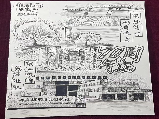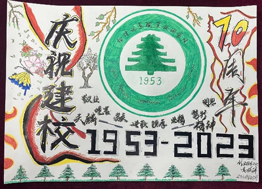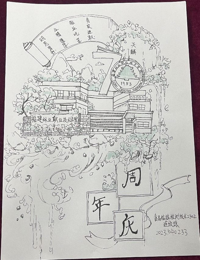 为活跃福建林业职业技术学院七十周年氛围。林学系两委会纪检部于2023年10月18日举办了一场以“手绘建校70周年暨高职办学20周年纪念”主题的周年活动。活动发起,由工作人员为参加活动的同学们发放纸张,同时向大家介绍本次活动的规则、目的及意义,增加学生对学校的热爱,充分调动了大家的积极性。以下是本次比赛的获奖作品。